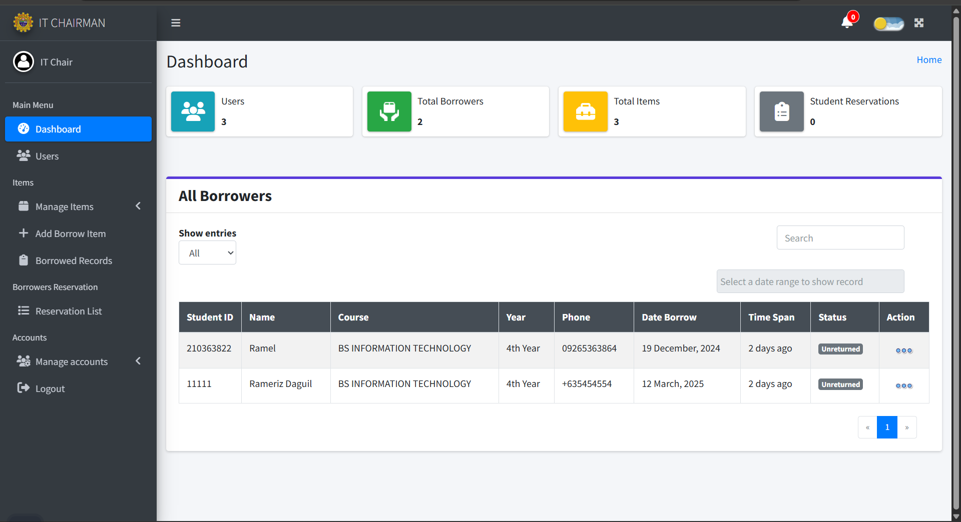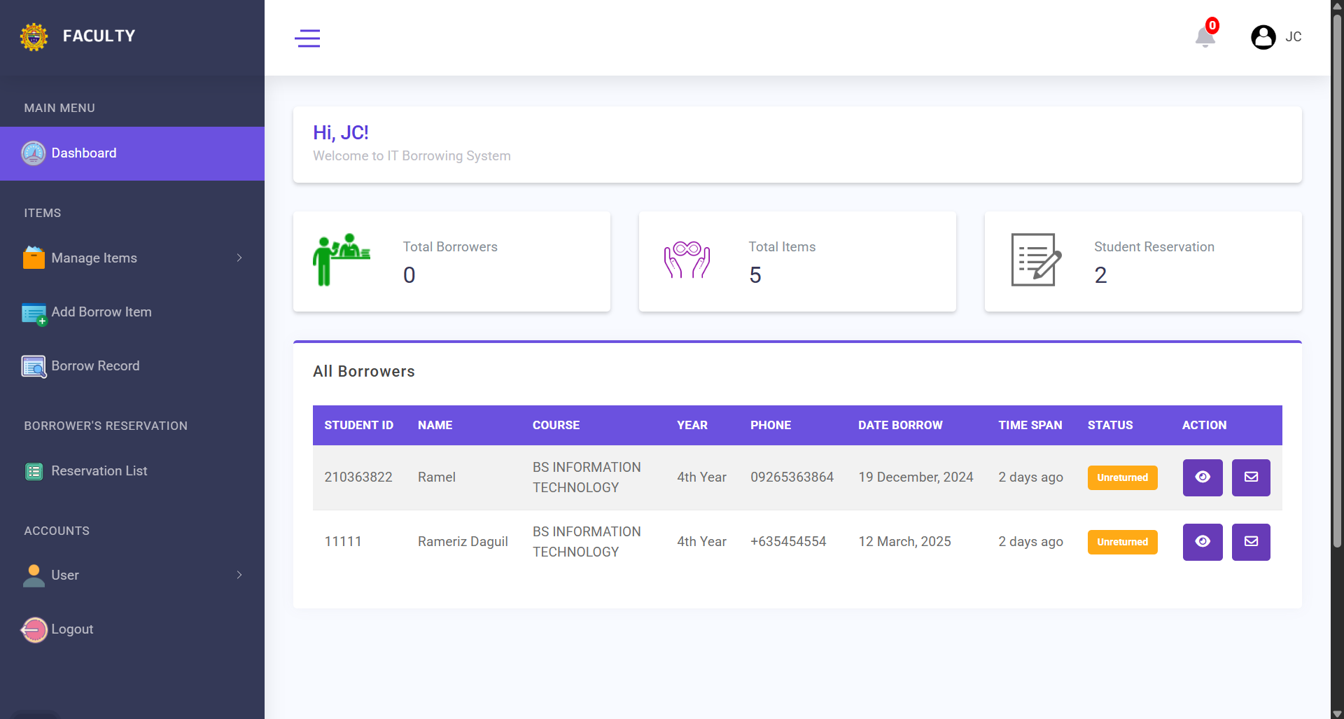 This system enables IT faculty to manage item borrowing, returning, and monitoring, while also allowing borrowers to reserve items in advance and ensure timely returns. The system aims to address the challenges of the current manual borrowing process, which is slow, prone to errors, and reliant on paper documentation. By introducing a web-based platform, the project seeks to streamline borrowing procedures, enhance efficiency, reduce errors, and improve data accuracy for both the IT faculty and borrowers.