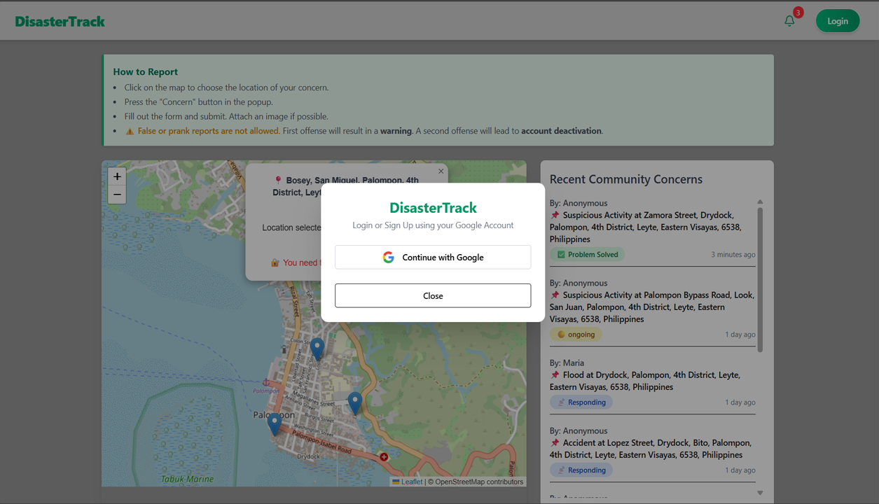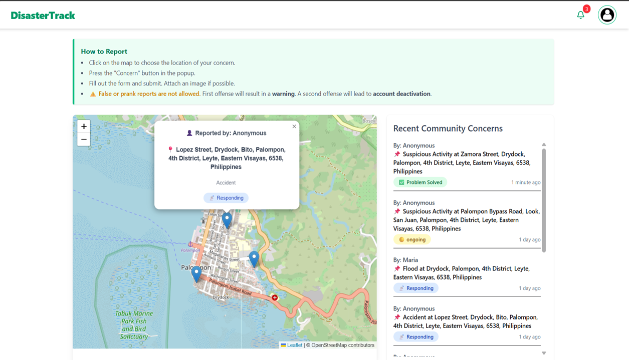 - Recent Community Concerns Panel: Displays latest submitted concerns beside the map in real-time.