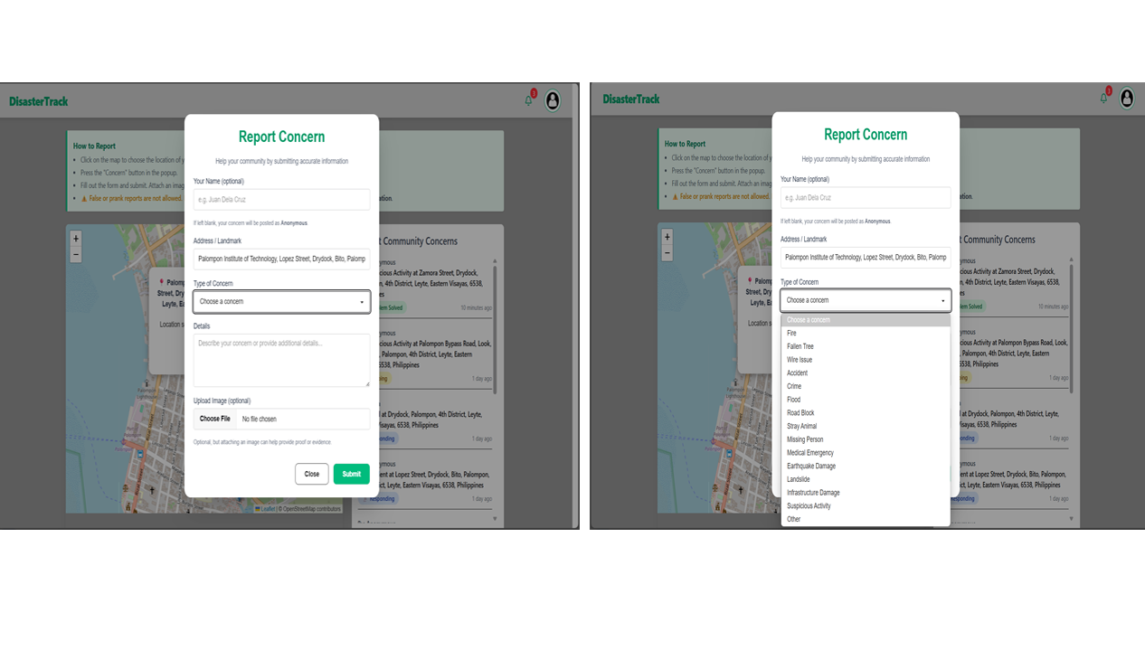 After clicking the “Concern” button, a modal appears allowing users to submit details about the incident. The form includes fields for name (optional—defaults to “Anonymous” if left blank), auto-filled address based on the selected map location, concern type (e.g., fire, flood, road block), a detailed description, and an optional image upload to support the report.