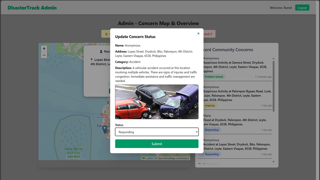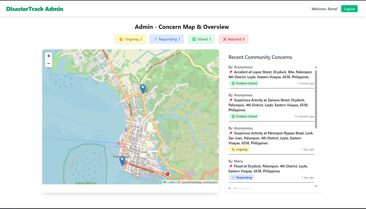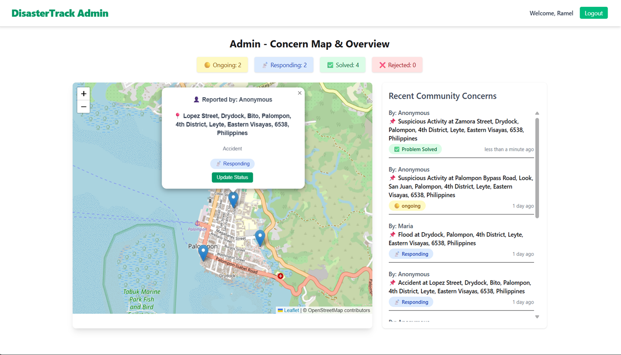 - Status Filtering: Admin can filter map markers by status: Ongoing, Responding, Problem Solved, or Rejected.