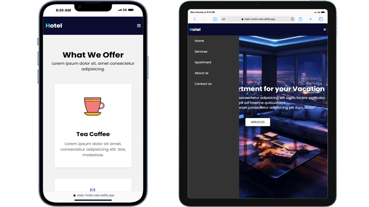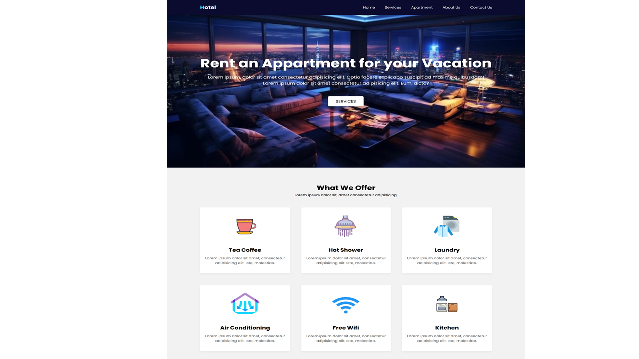 A modern, responsive hotel website built with HTML and CSS, designed to showcase apartment rental services with an elegant layout and user-friendly navigation. This website is ideal for hotels, resorts, or apartment businesses looking to establish a professional web presence.