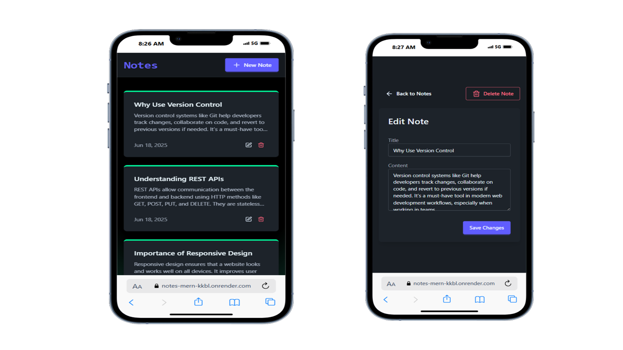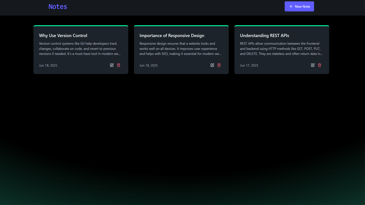 Notes MERN App is a full-stack note-taking application built with the MERN stack (MongoDB, Express.js, React.js, Node.js). It enables users to create, edit, and delete notes in a clean and responsive interface. The app integrates Upstash Redis for rate limiting to prevent request abuse, and includes smooth loading effects for a polished user experience. Itβs perfect for practicing CRUD operations, middleware usage, and deploying full-stack applications on free-tier hosting like Render.com.