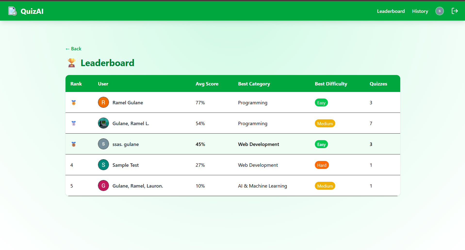 - Leaderboard displaying users, average scores, and best-performing quiz categories